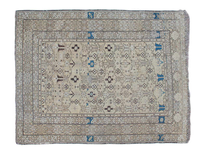 having repeating geometric pattern on an ivory ground, set within multiple borders.