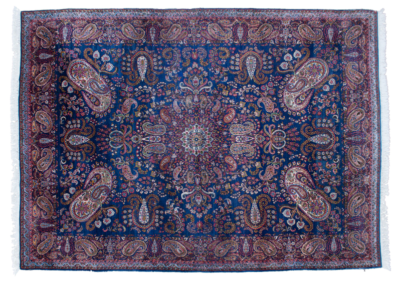 the scrolling floral center medallion on a blue reserve set within multiple borders.