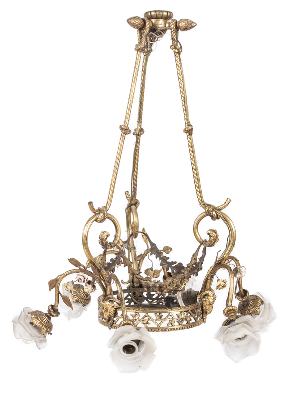 of basket form with frosted glass floral-form shades.