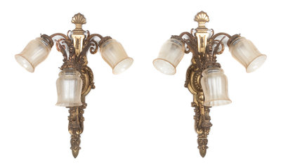 A Pair of Neoclassical Gilt Brass Three-Light Sconces