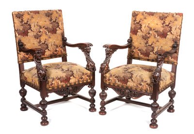 each having a tapestry upholstered back and seat within figural carved arms, raised on turned legs joined by stretchers.