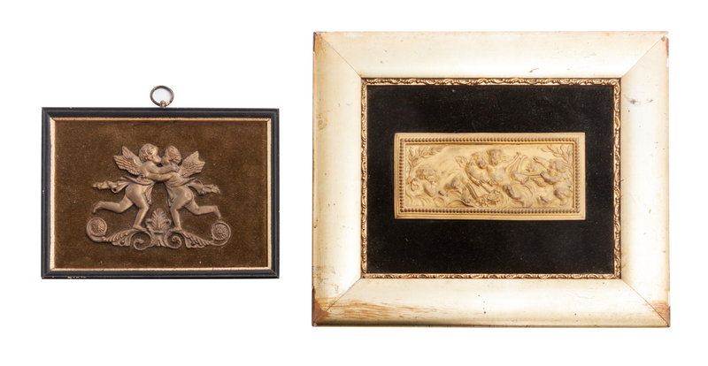depicting a band of putti, together with a framed cast metal furniture mount depicting two putti.