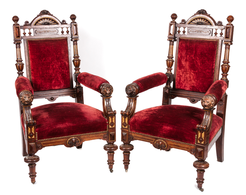 each having upholstered back, arms and seat, set in lion mask carved frame.