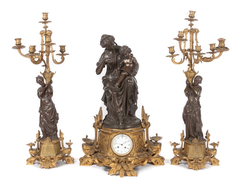comprising a clock and pair of six-light candelabra.