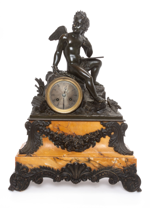 surmounted with Cupid seated above steel dial with Roman numerals.