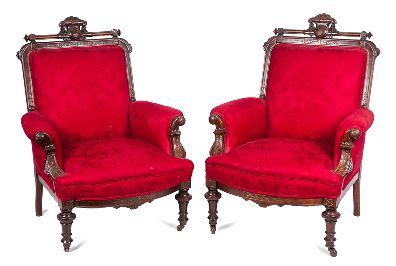 each with foliate crest above upholstered back, arms and seat, raised on turned legs ending in casters.