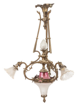 A Victorian Gilt Metal and Frosted Glass Five-Light Fixture