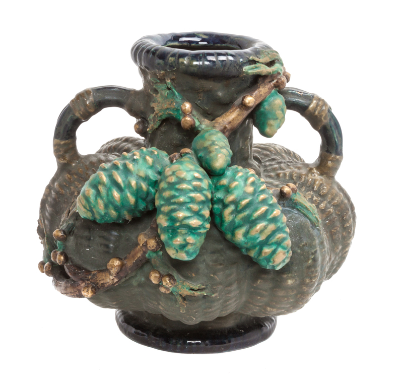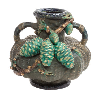 of lobed handled form with pinecone decoration.