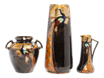 Phoenix Ware, of tapering form with peacock decoration, together with two similar Thomas Forester and Sons, Ltd. vases, 3 items total.