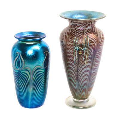 with applied spider decoration, together with a studio glass vase with pulled feather decoration, 2 items total.