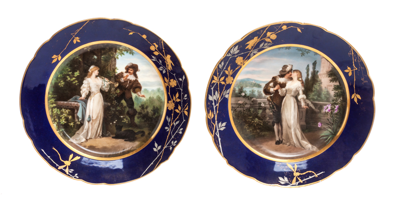 comprising a portrait plate with giltwood frame and two plates depicting courting couples.