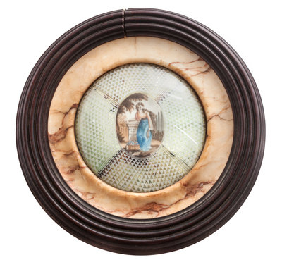 depicting a maiden in a graveyard, set in a marble mounted circular frame.