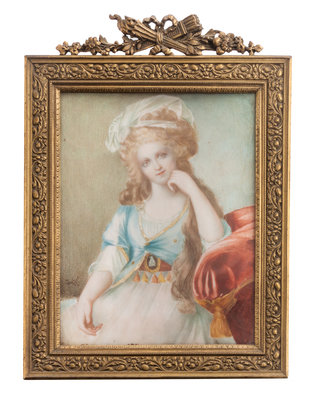 depicting a seated girl, signed illegibly, set in a bronze frame.