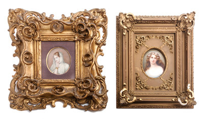 together with a portrait miniature, each depicting ladies, set in giltwood frames.