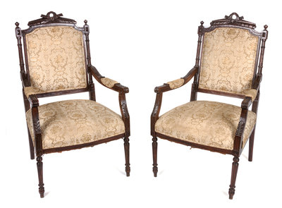 each with wreath and quiver form crest with upholstered back, arm and seats, raised on fluted tapering legs.