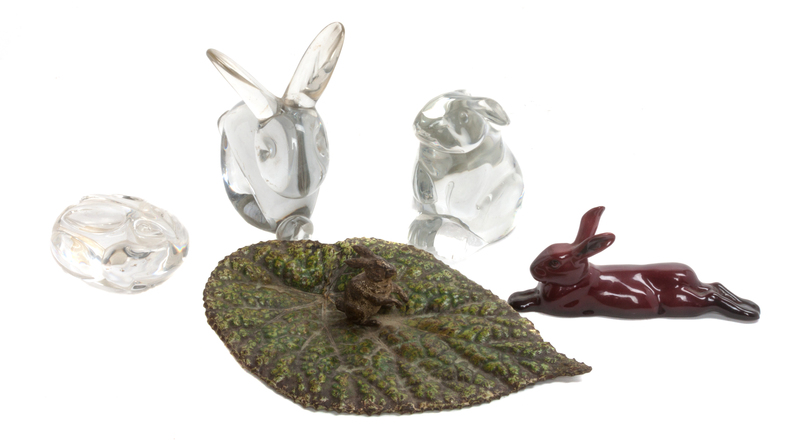 including a Steuben hand cooler, a Continental cast metal rabbit on leaf, and three others.