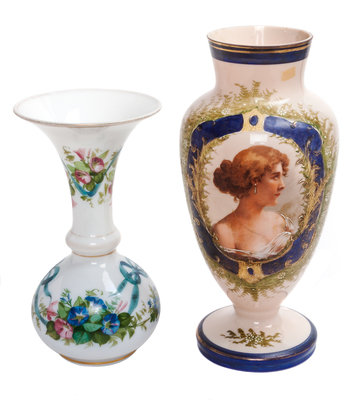 each of baluster form, the taller decorated with the portrait of a lady, the other with ribbon-tied flowers.
