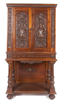 having two paneled doors with carved decoration raised on turned supports joined by plinth base.