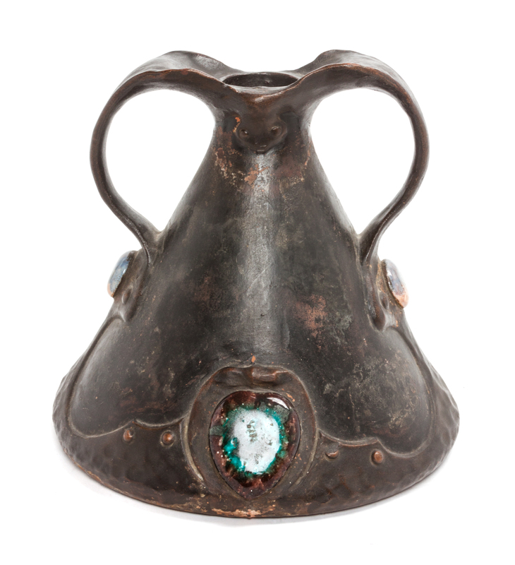 of conical handled form, decorated in Arts and Crafts style.