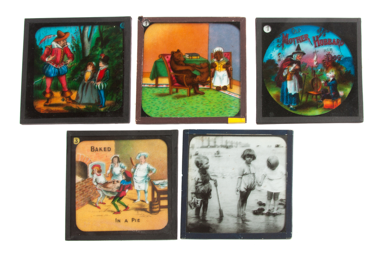 comprising three from the Primus Junior Lecture Series, The Three Bears, Sing a Song of Sixpence and The Babes in the Wood, another boxed set depicting Mother Hubbard, and an additional black and white lantern slide of children.