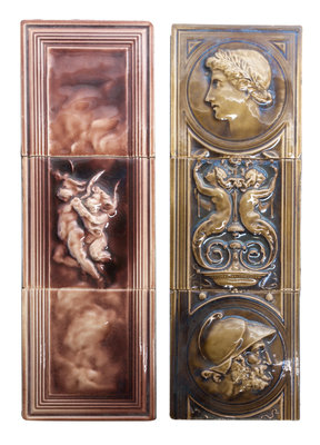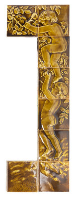 comprising three figural sets, the largest a set of 8 individual tiles depicting two children climbing in branches.