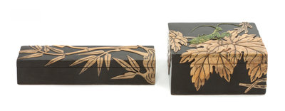 one decorated with a grasshopper, the other decorated with bamboo.