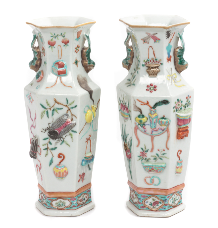 each of hexagonal form with a flared mouth, the body with applied precious objects, the neck flanked by a pair of handles in the form of recumbent lions, bearing a six-character Tongzhi iron red seal mark to the underside.