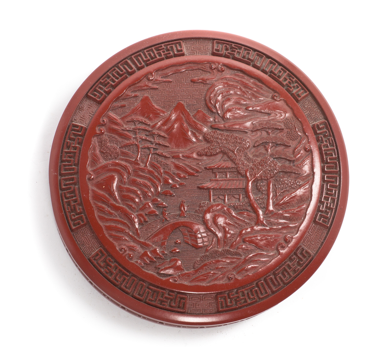 of circular form, the cover carved to show a scholar and his attendant crossing the bridge amongst a pavilion, trees and rockworks, together with five writing implements including one inkcake, one inkstone, one water dropper and two brushes.