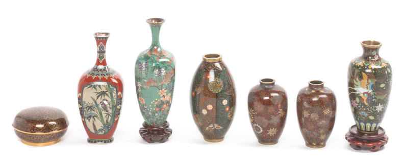 comprising a pair of small baluster vases decorated with multiple flowerheads, against a dark caramel ground; a tall vase with floral design against blue ground; a vase with phoenix bird decoration; a square sectioned vase with floral design against a red ground; a vase with floral panels; and a small circular box and cover densely decorated with flowerheads.