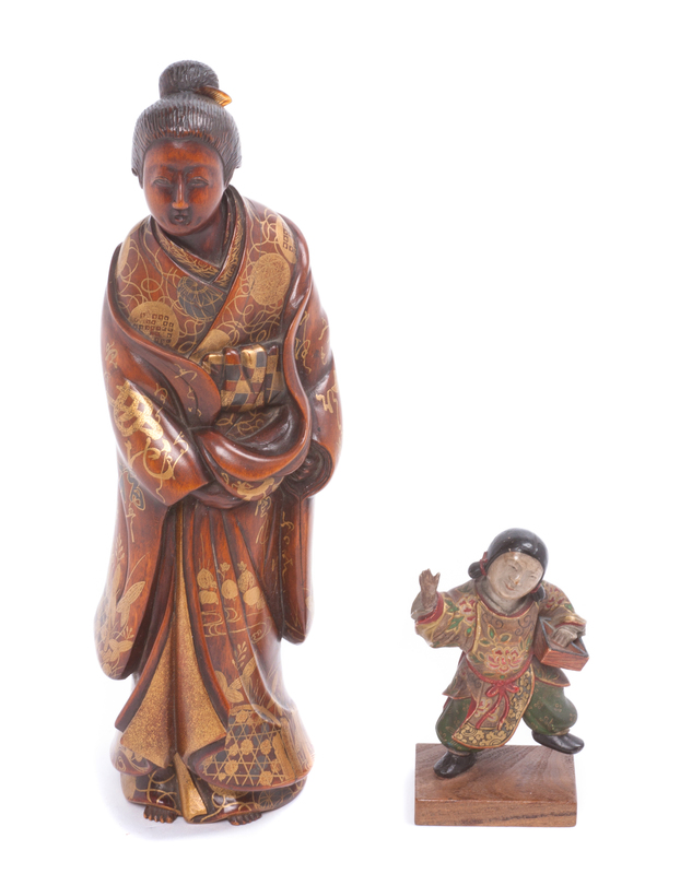 one depicting a playful child bearing a box in his left hand, the second a standing geisha with the base bearing a two-character maker's mark.