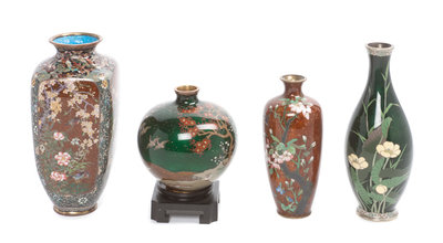 including a square sectioned one decorated with floral panels; a pear-shaped one decorated with floral sprigs against a green ground; a red one decorated with prunus and a baluster one painted to show prunus tree on a green ground.