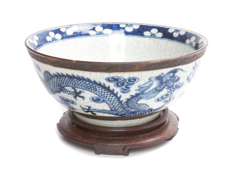 the rounded wells painted to show a striding dragon chasing the flaming pearl amongst clouds, the mouth rim glazed brown, the interior with prunus decoration, a flaming pearl and further clouds, raised on a rosewood stand.