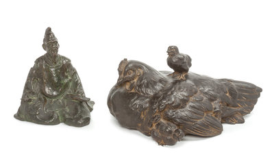 of a chicken and two chicks, together with a bronze of a seated man, 2 items total.