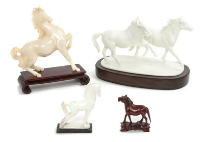 comprising an unmarked bisque example of two running horses, a carved alabaster example, a carved wood example and a cast resin example.