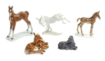each depicting a horse, together with a Danish example and an unmarked example, 5 items total.