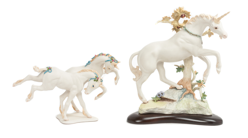 depicted standing near a tree, signed Cybis/AP, together with a figural group of unicorns, 2 items total.