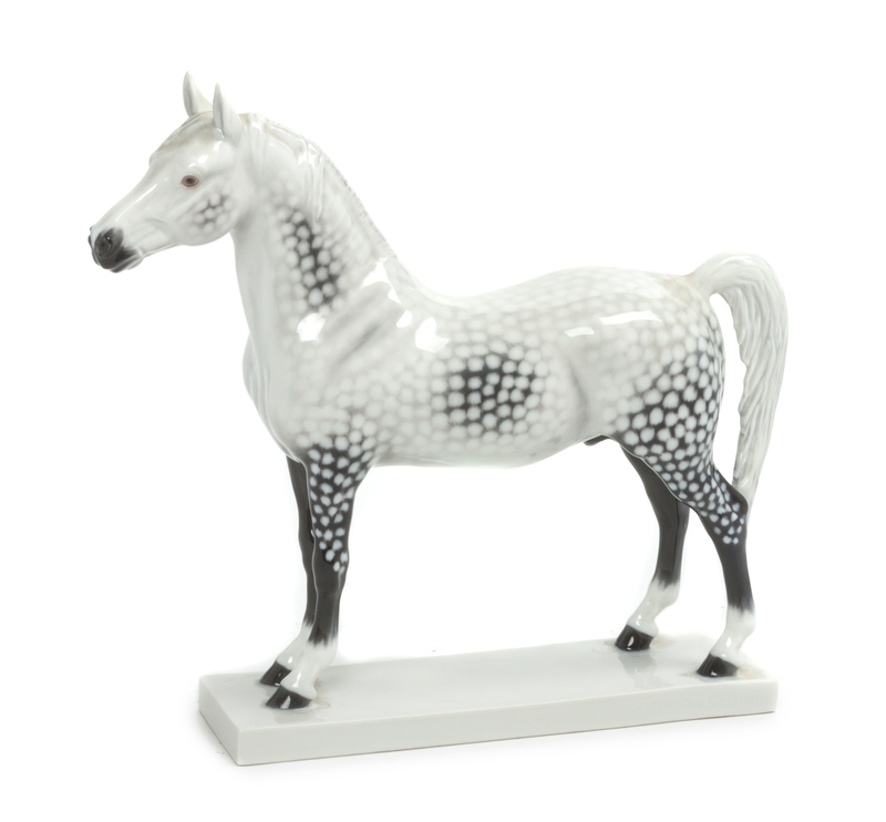 depicting a standing spotted horse.
