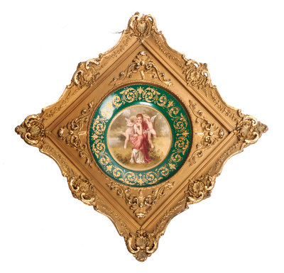 depicting a maiden and two putti, after Bouguereau, set in giltwood frame.