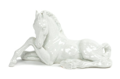depicting a recumbent horse, with crossed swords in underglaze blue.