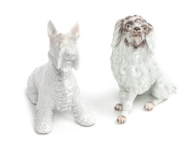 each depicting a seated long-haired dog, having crossed swords in underglaze blue.