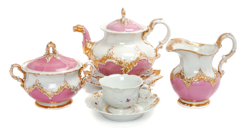 comprising a teapot, creamer and covered sugar, together with an associated Meissen leaf-form dish and cup-and-saucer set, 6 items total.