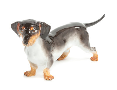 depicting a standing dachshund, with crossed swords in underglaze blue.