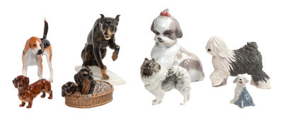 various makers, together with a terracotta dog and a composite dog, 9 items total.