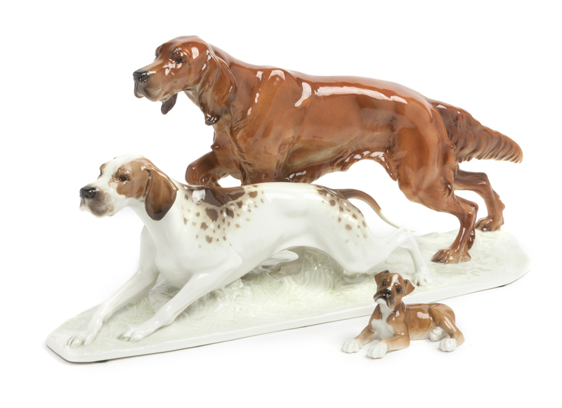 the larger group depicting two hunting dogs, the smaller single depicting a recumbent dog.