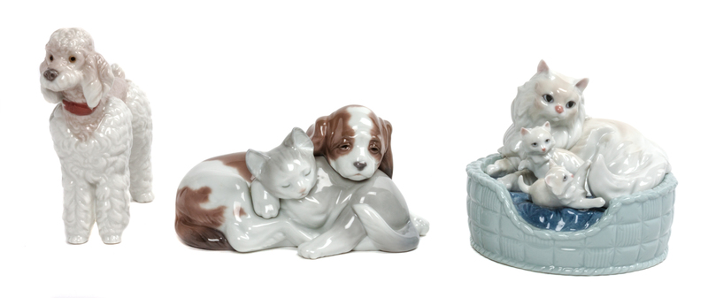 comprising a poodle, a puppy with kitten and a mother cat with kittens.
