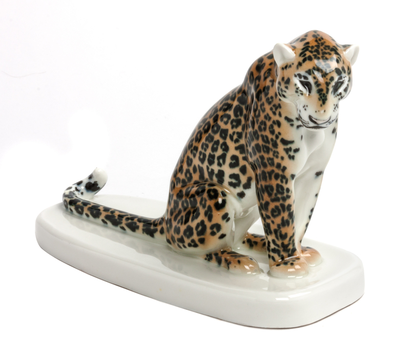 depicting a seated leopard, with crossed swords in underglaze blue.