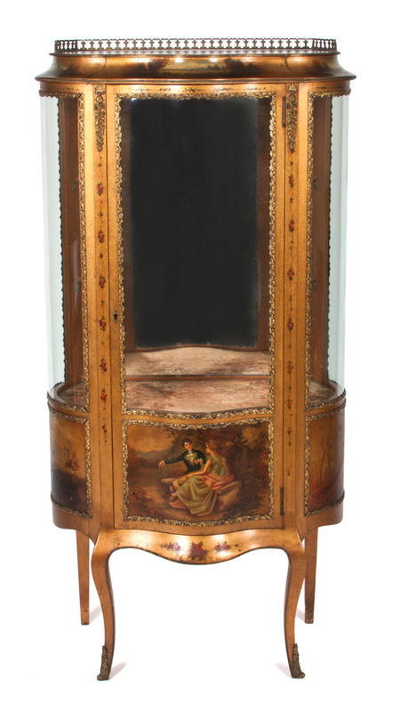 having a shaped front with handpainted panels, fitted with a conforming shaped glass-shelved interior.