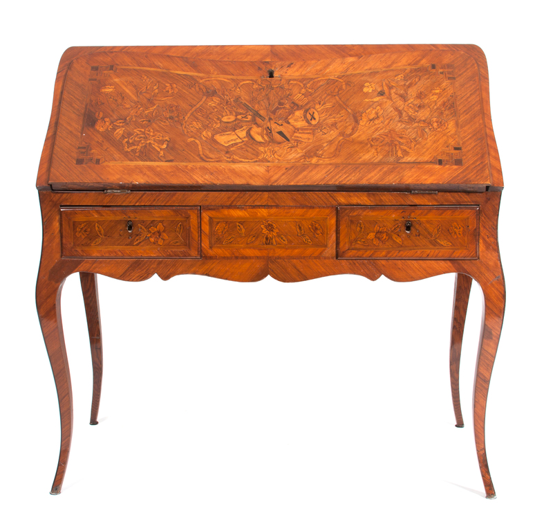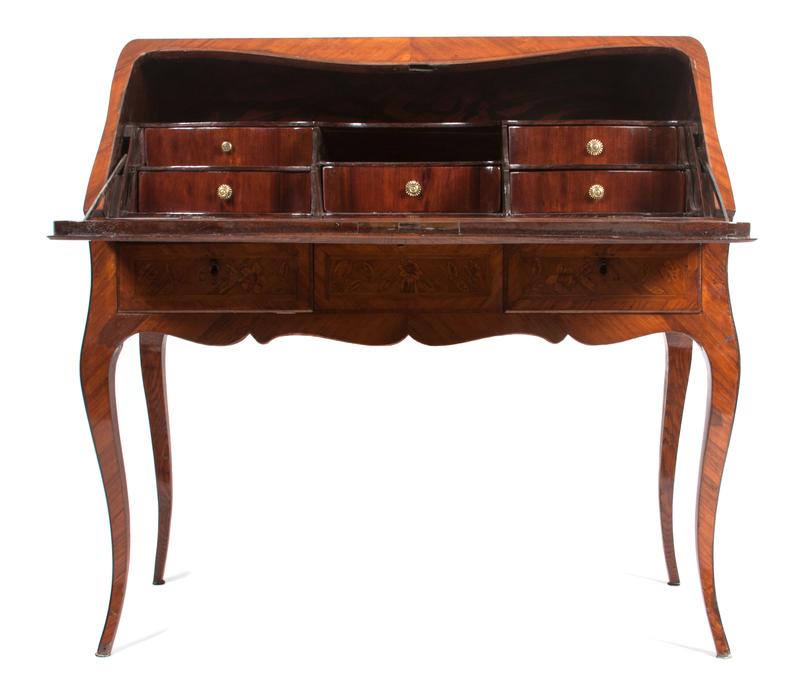having a fall front leather writing surface opening to a fitted interior above two drawers, raised on cabriole legs.