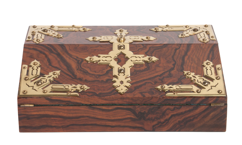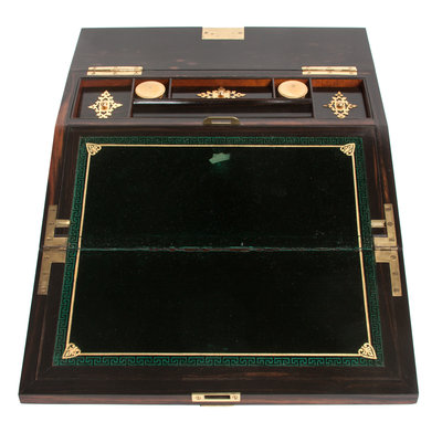of rectangular form opening to a fitted interior with velvet lined writing slope.