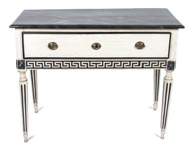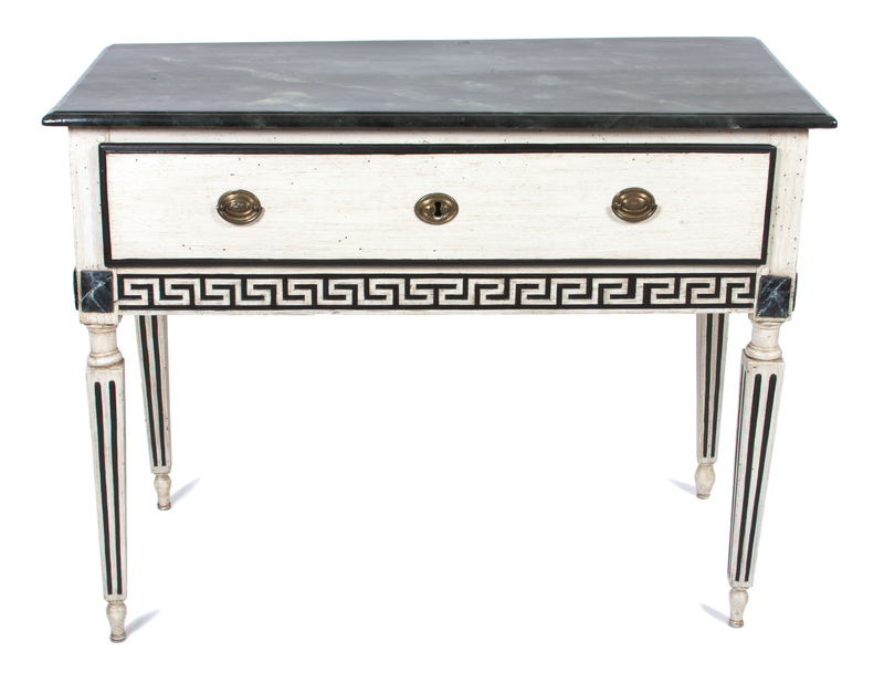 having a rectangular faux marble top over a frieze fitted with a single drawer and decorated with a Greek key motif, raised on square tapering fluted legs.